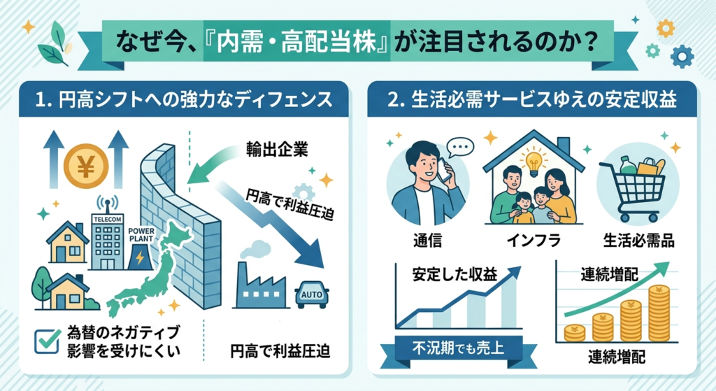 結論から言うと、今「内需・高配当株」が注目される最大の理由は、為替リスク(円高)への耐性が強く、業績が景気に左右されにくいため、安定したインカムゲイン(配当金)を中長期で狙えるからです。